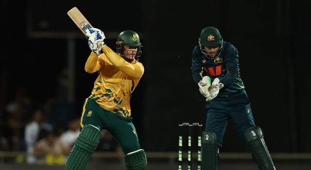 জবাবে ব্যাট করতে নেমে প্রথম ওভারেই হ্যাজেলউডের শিকার হন এইডেন মার্করাম। ইনিংস বড় করতে ব্যর্থ হন তিনে নামা লুহান ড্রে প্রিটোরিয়াস। আর পাওয়ার প্লের শেষ ওভারে ডেওয়াল্ড ব্রেভিস ফিরে গেলে ৪৮ রানে তিন উইকেট হারিয়ে বিপাকে পড়ে প্রোটিয়ারা।