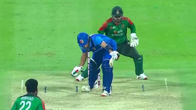 একদম নিখুঁত এক গুগলি দিলে রহমত শাহকে অভ্যর্থনা জানালেন রিশাদ! বল ভেতরে ঢুকে প্যাড হয়ে সরাসরি পেটে আঘাত হানে। হঠাৎ থমকে যান রহমত। ব্যাথায় মাটিতে লুটিয়ে পড়েন। বোঝাই যাচ্ছে, কাফ মাসলে আবারও টান লেগেছে। বাংলাদেশর অধিনায়ক মেহেদী হাসান মিরাজ দৌড়ে গিয়ে তাকে তুলে দাঁড়াতে সাহায্য করেন। এগিয়ে আসেন বাংলাদেশের বাকি খেলোয়াড়রাও।