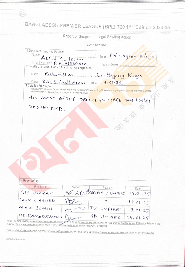 ম্যাচ অফিসিয়ালদের দেওয়া প্রতিবেদন পেয়েছে খেলা ৭১। গেল ১৯ জানুয়ারির সেই ম্যাচ প্রতিবেদনে বলা হয়, আম্পায়ার ও ম্যাচ অফিসিয়ালদের চোখে তাঁর প্রায় সব ডেলিভারিতেই সমস্যা আছে। সেখানেই সই করেছেন দুই অনফিল্ড আম্পায়ার শরফুদ্দৌলা ইবনে শহীদ সৈকত ও তানভীর আহমেদ। এছাড়া তৃতীয় ও চতুর্থ আম্পায়ার হিসেবে সই করেছেন মোরশেদ আলী খান সুমন ও মোহাম্মদ কামরুজ্জামান।