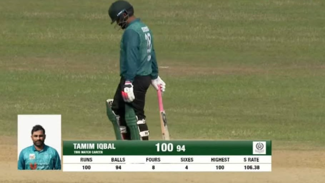 আল আমিন হোসেনের বলটা স্কোয়ার ড্রাইভে পয়েন্টে ঠেলে দিলে একটা রান। ধারাভাষ্যকক্ষ থেকে শোনা গেল, তামিম ইকবালের জয়ধ্বনি। লিস্ট এ ক্যারিয়ারের ২৪ তম সেঞ্চুরি তুলে নিলেন ব্রার্দাস ইউনিয়নের বিপক্ষে। চলতি ডিপিএলে টানা দুই সেঞ্চুরি হাঁকালেন সাবেক এই টাইগার ওপেনার। এতেই প্রথম ম্যাচে হোঁচট খেলেও টানা তিন জয়ে উড়ছে তামিমের মোহামেডানও।