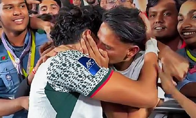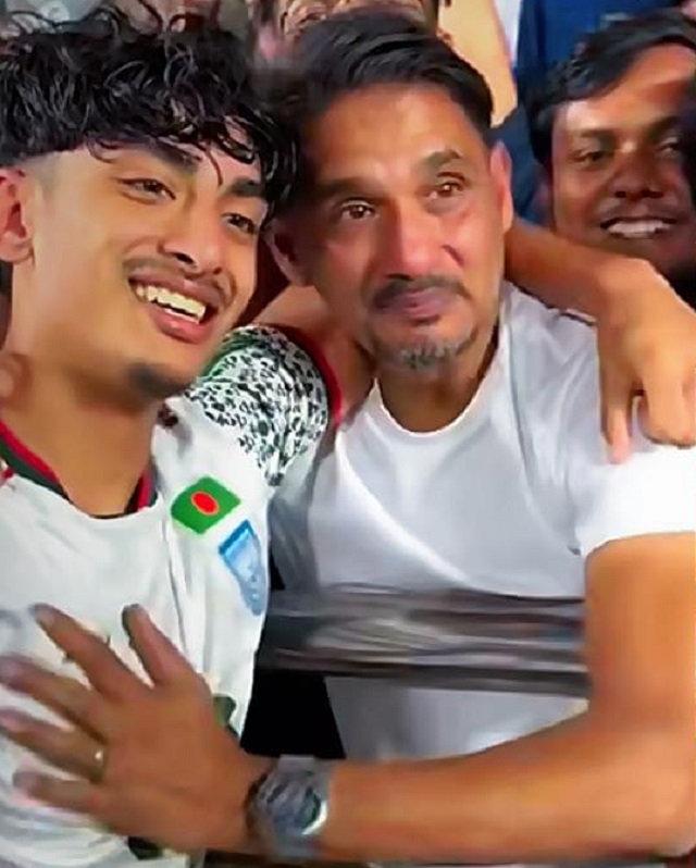 বাবা শরীফ আহমেদ নিজেকে সামলাতে পারলেন না। বাবা-ছেলের দুজনের আনন্দে চোখ ভিজে গেল! সুন্দর এই মুহূর্তটা বাঁধাই করে রাখার মত এক দৃশ্য। এই সুখের বন্যায় ভরে গেল বাংলাদেশের ফুটবল।