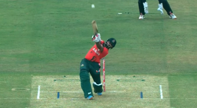 ফিনিশিং স্টান্স দেখে মনে হবে লং অনের উপর দিয়ে ছক্কা হাঁকিয়েছেন শামীম হোসেন পাটোয়ারি, তবে বলটা উইকেটকিপারের মাথার উপর দিয়ে পার হয়েছে সীমানা দড়ি। ওই স্টান্সে দাঁড়িয়ে থেকে ওরকম শট খেলতে বোধহয় স্বয়ং এবি ডি ভিলিয়ার্সও দ্বিধান্বিত হবেন। তবে শামীম করে দেখিয়েছেন, ১৩ বলে ৩১ রানের টর্নেডোতে ম্যাচটাকেও ছিনিয়ে নিয়েছেন।