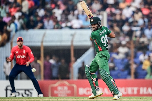 তবে দুই ওপেনার ফিরে গেলেও বাংলাদেশের লক্ষ্যকে সহজ বানিয়ে দেন নাজমুল হোসেন শান্ত আর অভিষিক্ত তৌহিদ হৃদয়। এমনিতে অন্যান্য ম্যাচে অ্যাঙ্করিং রোলে খেলা শান্তকে এ দিন দেখা যায় অন্য রূপে। শুরু থেকেই বাউন্ডারির উপর নজর দেন তিনি। মার্ক উডের এক ওভারে টানা ৪ টা চার মারেন তিনি। ঝড়ো ব্যাটিংয়ে ব্যক্তিগত অর্ধশতক পূরণ করেন মাত্র ২৭ বলে। তবে ফিফটির পরে আর উইকেটে টিকতে পারেননি তিনি। ব্যক্তিগত ৫১ রানে উডের বলে বোল্ড হন শান্ত।