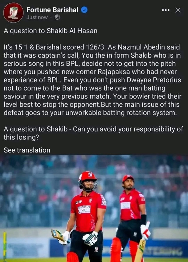ইংরেজিতে লেখা সেই পোস্টটির ভাবানুবাদ করলে দাঁড়ায়, ‘সাকিব আল হাসানের কাছে একটি প্রশ্ন। ১৫.১ ওভারে বরিশালের স্কোর ছিল ১২৬ রানে ৩ উইকেট। কোচ নাজমুল আবেদিন ফাহিম বলেছেন, এটা ক্যাপ্টেন’স কল ছিল। অথচ পুরো টুর্নামেন্টে ব্যাট হাতে দারুণ ছন্দে থেকেও আপনি ব্যাটে এলেন না। আপনি রাজাপাকশেকে ব্যাটে নামালেন, যার কিনা বিপিএলের কোনো ম্যাচ খেলারই অভিজ্ঞতা নেই। এমনকি গত ম্যাচে দুর্দান্ত ব্যাটিং করা প্রিটোরিয়াসকেও নামাননি। আপনি বোলিং দিয়ে ম্যাচ জেতার যথেষ্ট চেষ্টা করেছেন। কিন্তু এই পরাজয়টা এসেছে এমন ব্যাটিং অর্ডারের সিদ্ধান্তের কারণে। সাকিবের কাছে প্রশ্ন। আপনি এ ম্যাচ হারের দায় এড়াতে পারেন?’