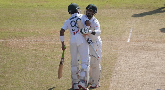 তার সাথে ওয়ানডে ধাঁচে ব্যাটিং করে গেলেন লিটন দাসও। লিটন থেমেছেন ৬০ রানে। শান্তর ব্যক্তিগত সংগ্রহ ঠিক ঠিক ১০০। এরপর অবশ্য বাকিটা সময় বাংলাদেশ বড় কোন জুটি গড়তে পারেনি। চা বিরতির পর অধিনায়ক শান্ত ইনিংস ঘোষণা করে দিলেন। স্কোরবোর্ডে তখন রান ৫৮৭, আট উইকেটের বিনিময়ে।
