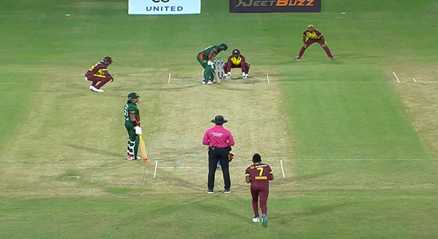 তবে আকিল হোসেন পাওয়ার-প্লেতে বাংলাদেশকে ক্রিজের মধ্যে রীতিমত বন্দী করে রেখেছিলেন। নিজের স্পেলের চার ওভারে ১৮ খানা ডট বল দিয়েছেন তিনি।
