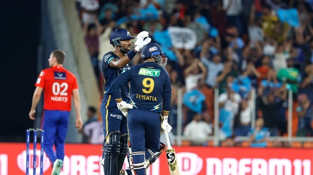 আর এ জুটিই শুরুর বিপর্যয় কাটিয়ে গুজরাটকে ম্যাচে রেখেছিল। অভিনব মনোহর ফিরে যাওয়ার পর ব্যক্তিগত অর্ধশতক পূরণ করেন হার্দিক পান্ডিয়া। তবে ম্যাচে মোড় ঘুরিয়ে দেন রাহুল তেওয়াতিয়া। শেষ ৯ বলে ৩০ রানের প্রায় অসম্ভব হয়ে ওঠা সমীকরণে হঠাতই এ বাঁ-হাতি ব্যাটারের ব্যাটিং ঝড়ে ম্যাচে দারুণ ভাবে ঘুরে দাঁড়ায় গুজরাট।