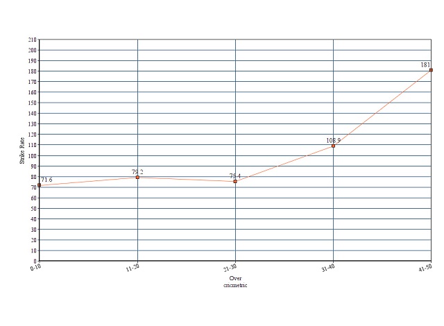 এখানে প্রতি ১০ ওভারে লিটনের স্ট্রাইক রেটের একটা গ্রাফ দেখানো হয়েছে।।এখানেই আমরা দেখতে পাচ্ছি, ম্যাচের শুরুতে পাওয়ারপ্লে-তে লিটনের স্ট্রাইক রেট ৭১.৬ হলেও সেটা সেট হওয়ার পর আর কমেনি, বরং আরো বেড়েছে। ১১-২০ ওভারে সেটা ৭৯.২ হয়ে ২১-৩০ ওভারে সেটা ৭৫.৪ হলেও পরের বিশ ওভারে লিটনের স্ট্রাইক রেটের গ্রাফ অনেক বেশি উপরের দিকে উঠেছে। ৩১-৪০ ওভারে সেটা ১০৮.৯ হয়ে ৪১-৫০ ওভারে সেটা ছুঁয়ে ফেলেছে ১৮১ কে।