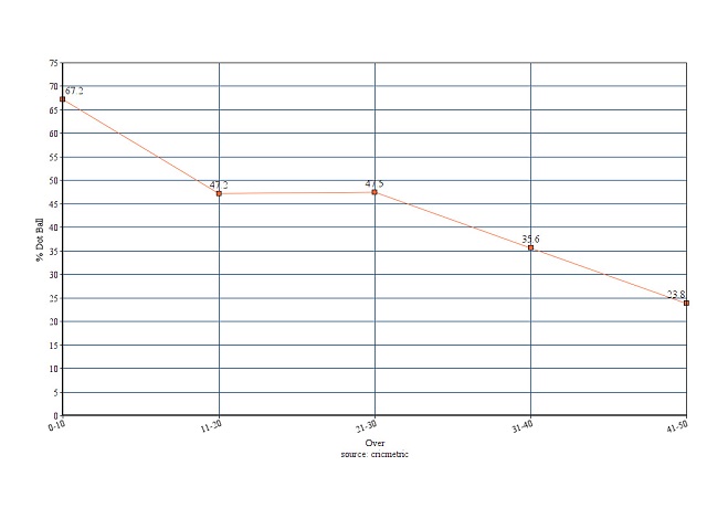 ম্যাচের শুরুতে তিনি ডট বল খেলেছেন, সেট হয়েছেন, আর এরপর সেট হওয়ার পর নিজের খেলা ডট বলগুলিকে তিনি পুষিয়ে দিয়েছেন। সেটা অবশ্য নিচের গ্রাফ দেখলেই বোঝা যায়, এখানে দেখা যায় ওভার পার হলে লিটনের ডট বল খেলার হার শুধু নিচের দিকেই নেমেছে।