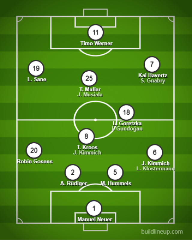 কিমিখ রাইটব্যাক হিসেবে খেললে মাঝে থাকবেন ক্রুস আর গোরেৎস্কা। আর কিমিখ মাঝে চলে আসলে তা হয়ে যাবে ক্রুস-কিমিখ। গুন্দোদানের ইনজুরি সামান্য পিছিয়ে দিয়েছে তাকে। থমাস মুলার থাকছেন অ্যাটাকিং মিড হিসেবে। তবে ডানে হাভার্টজ আর ন্যাব্রির মধ্যে অদল বদল হবে কিমিখের উপর ভর করে।