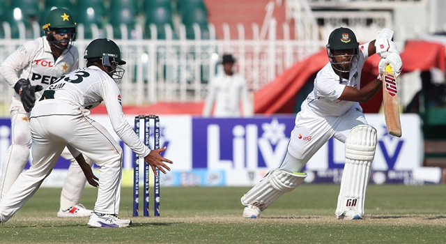 ১২ রানের লিড নিয়ে নিজেদের দ্বিতীয় ইনিংস শুরু করে পাকিস্তান। কিন্তু পাকিস্তানকে কোন প্রকার স্বস্তির নিঃশ্বাস নিতে দেননি হাসান মাহমুদ। শেষ বেলায় পাকিস্তানের দুইটি উইকেট তুলে নেন হাসান। প্রথম উইকেট হিসেবে শিকার করেন আবদুল্লাহ শফিকের উইকেট। অফ স্ট্যাম্পের বাইরের বলে ড্রাইভ করতে গিয়ে উইকেটের পেছনে ক্যাচ দেন শফিক। লিটন কোন রকম ভুল করেননি।