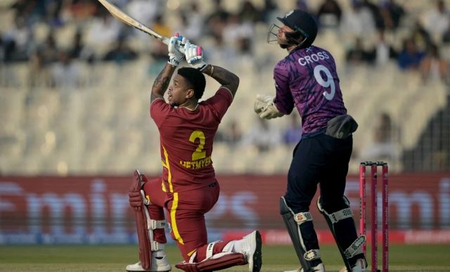 খুনে মেজাজে দৃষ্টিনন্দন ব্যাটিং করে গেলেন শিমরন হেটমায়ার। নামের পাশে জাত টি-টোয়েন্টি ব্যাটারের তকমা। সেটারই বাস্তব প্রতিফলন ঘটালেন স্কটল্যান্ডের বিপক্ষে। ঝড় তুললেন ঠিকই সাথে মুগ্ধতা ছড়িয়ে গেলেন মাঠজুড়ে।