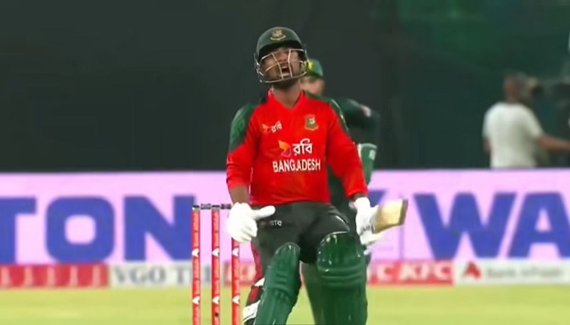 হাসান আলীর অফ-স্টাম্পের বাইরে শর্ট বলটা টেনে খেলতে গিয়ে টো-এন্ড করে ফেললেন লিটন দাস। মিড-অনেই সহজ ক্যাচ নিলেন হারিস রউফ। ইনিংসের মাত্র ষষ্ঠ ওভারে, দলীয় ৫৪ রানে তৃতীয় উইকেট। চাপের ম্যাচ, বড় লক্ষ্য, আর নিজের ছন্দহীনতা—সব মিলিয়ে ধৈর্য হারালেন লিটন। আউট হয়েই ছুঁড়ে মারলেন ব্যাট উইকেটের দিকে।