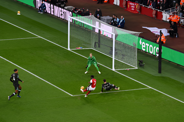 রিয়াল মাদ্রিদ বার্সেলোনার অফসাইড ট্র্যাপ ভাঙতে না পারলেও বুকায়ো সাকা পেরেছেন লিভারপুলের অফসাইড ট্র্যাপ ভাঙতে। বেন হোয়াইটের লং বল রিসিভ করেই অ্যান্ড্রু রবার্টসনকে বোকা বানিয়ে তিনি ছুটে যান গোলরক্ষকের দিকে। এরপর বাম পায়ের জোরালো শটে টপ কর্নার খুঁজে নেন, দলকে এগিয়ে দেয়ার পাশাপাশি পূর্ণ করেন ক্লাবের হয়ে পঞ্চাশ গোলের মাইলফলক।