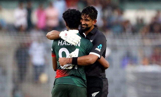 ইশ সোধি ফিরে যাচ্ছিলেন সাজঘরে। ফেরার সময় হঠাৎ ঘুরে বাংলাদেশ দলকে উদ্দেশ্য করে হাত তালি দিলেন। অধিনায়ক লিটন আম্পায়ার মারিয়াস ইরাসমাসের সাথে কথা বললেন। ডেকে পাঠালেন ইশ সোধিকে। সোধি ফিরে জড়িয়ে ধরলেন হাসান মাহমুদকে।