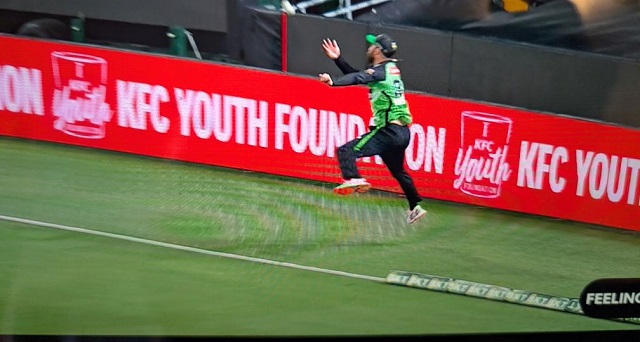বলটি লং অফের উপর দিয়ে বাউন্ডারির বাইরে চলেই যাচ্ছিল। কিন্তু বিধিবাম, দৃশ্যপটে হাজির গ্লেন ম্যাক্সওয়েল। রীতিমতো সুপারম্যানই যেন বনে গেলেন তিনি।