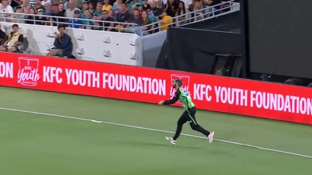 ম্যাক্সওয়েল ডানদিকে দ্রুত দৌড়ে যান, নিখুঁত লাফ দিয়ে এক হাতে বলটি থামালেন। এই অসাধারণ লাফের সময়, তিনি নিজের ভারসাম্য বজায় রাখলেন। বলটি মাঠের মধ্যে ফিরিয় এনে নিজ হাতেই লুফে নিলেন ক্যাচটি। এ ধরনের ফিল্ডিং সচরাচর তো দেখা যায় না।