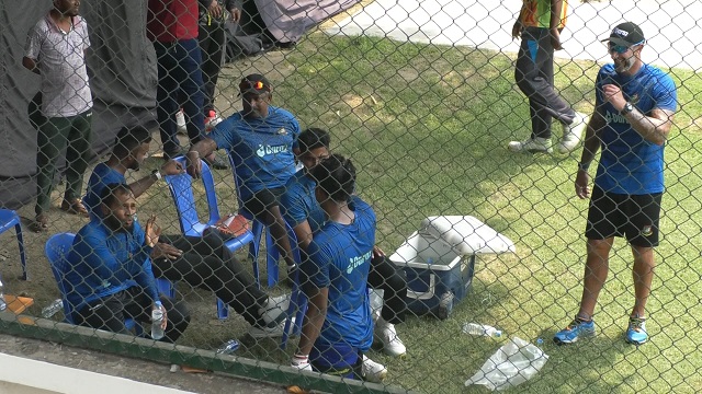 নেটে ব্যাটিং অনুশীলন শেষে হাসান মাহমুদ তখন ক্লান্ত। তাকে নিয়ে খানিকটা মজায় মেতে উঠলেন, মুশফিকুর রহিম, এবাদত হোসেন ও খালেদ হাসানরা। পাশে বসে শিষ্যদের ফুরফুরে মেজাজটা উপভোগ করছেন স্পিন বোলিং কোচ রঙ্গনা হেরাথ।