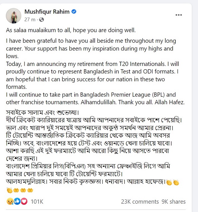 সামাজিক যোগাযোগ মাধ্যম ফেসবুকে দেওয়া এক বার্তায় মুশফিকুর রহিম ক্রিকেটের সবচেয়ে সংক্ষিপ্ত ফরম্যাট থেকে বিদায়ের ঘোষণা দেন। তিনি লিখেছেন, ‘টি-টোয়েন্টি আন্তর্জাতিক ক্রিকেট ক্যারিয়ার থেকে আজ আমি অবসর নিচ্ছি। তবে, বাংলাদেশের হয়ে টেস্ট এবং ওয়ানডে খেলা চালিয়ে যাবো। আশা করছি এই দুই ফরম্যাটে আমি আরো কিছু নিয়ে আসতে পারবো দেশের জন্য।’
