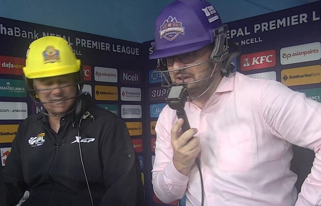 নেপাল প্রিমিয়ার লিগে ঘটল এক অভিনব দৃশ্য—নিরাপত্তার স্বার্থে কমেন্ট্রি বক্সেই হেলমেট পরে ধারাভাষ্য দিতে দেখা গেল দুই কমেন্টেটরকে!