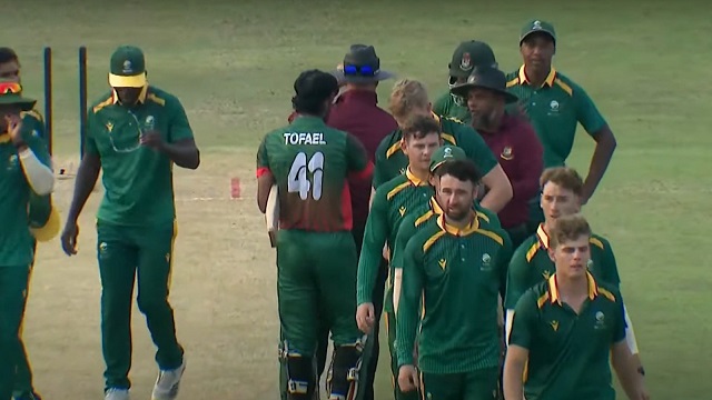 শেষ ওভারে সব কিছু হল। তোফায়েল আহমেদের লং অফের ছক্কা বাউন্ডারির বাইরে থেকে ফেরালেন দক্ষিণ আফ্রিকান ফিল্ডার। টেলিভিশন আম্পায়ার নেই বললে, সেটা আর দেখা গেল না। তাতেও বাংলাদেশ ইমার্জিং দলের জয় আটকানো গেল না। দুই বল বাকি থাকতে তোফায়েলের বাউন্ডারিতে জয়ের বন্দরে পৌছায় আকবর আলীর দল।