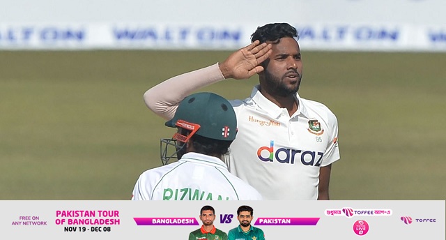 তবে তৃতীয় দিনে এসে নিজেকে যেন খুঁজে পেলে এবাদত হোসেন। পেয়ে গেলেন দুইটি উইকেট। প্রথমটি ফর্মে থাকা পাকিস্তানি উইকেটরক্ষক ব্যাটার মোহাম্মদ রিজওয়ানের, পরবর্তীটি বোলিং অলরাউন্ডার সাজিদ খানের। দু’টো উইকেটই তিনি উদযাপন করছেন সশস্ত্র বাহিনীর স্যালুটের মধ্য দিয়ে। এর পেছনে কাজ করেছে তাঁর ফেলে আসা জীবনের স্মৃতিকাতরতার পাশাপাশি সাবেক কর্মক্ষেত্রের প্রতি সম্মানবোধ।