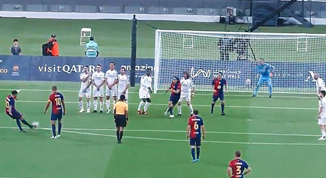 শুরুতেই হুয়ান পাবলোর গোলে এগিয়ে যায় বার্সা। ৪০ মিনিটে আসে সেই মাহেন্দ্রক্ষণ। সবাইকে অবাক করে আরো একবার বল জালে জড়ালেন ৪৪ বছর বয়সী রোনালদিনহো। ঠিক যেন সেই পুরানো দিনের গল্প, তরুন রোনালদিনহোর ফ্রি-কিক ঠেকাতে ওয়াল দিয়ে দাড়াঁতেন রিয়ালের রথি, মহারথীরা। তবুও ঠিকই জাল খুজে নিতেন রোনালদিনহো। দর্শকদের স্মৃতির জানালায় যেন আরেকবার উঁকি দিলেন তিনি।
