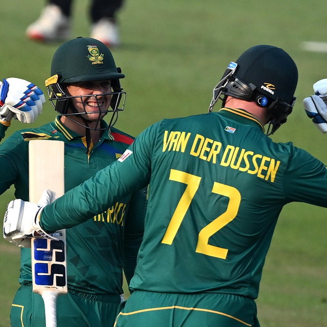 অধিনায়ক বাভুমা ২৪ রানে ফিরে গেলেও ইনফর্ম ডি কক আর ভ্যান ডার ডুসেনের ব্যাটে ভর করে ছুটতে থাকে প্রোটিয়ারা। দুজনের ২০০ রানের ম্যারাথন জুটিতে আরো একবার প্রতিপ্রক্ষকে পাহাড়সম টার্গেট দেয়ার ভিত গড়ে ওঠে। ১১৪ রানের মাথায় ডি কককে আউট করে এই জুটি ভাঙেন সাউদি, ততক্ষণে অবশ্য দলীয় রান পৌঁছে গিয়েছে ২৩৮-এ।