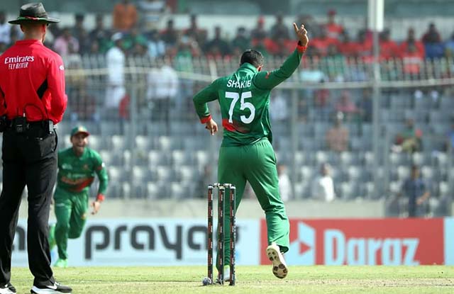 সাকিবের ছুঁড়ে দেয়া বলটা ঠিকই আঘাত করলো প্যাডে। সাথে সাথেই আম্পায়ার মাইকেল গফ আঙুলের ইশারায় আউট জানিয়ে দিলেন। ভারতের বিপক্ষে সাকিব আল হাসানের পঞ্চম উইকেট। ওয়ানডে ফরম্যাটে এই নিয়ে চতুর্থ ফাইফার। বাংলাদেশের ক্রিকেটে সাকিব মানেই রেকর্ড, সাকিব মানেই অনন্য সব কীর্তি।