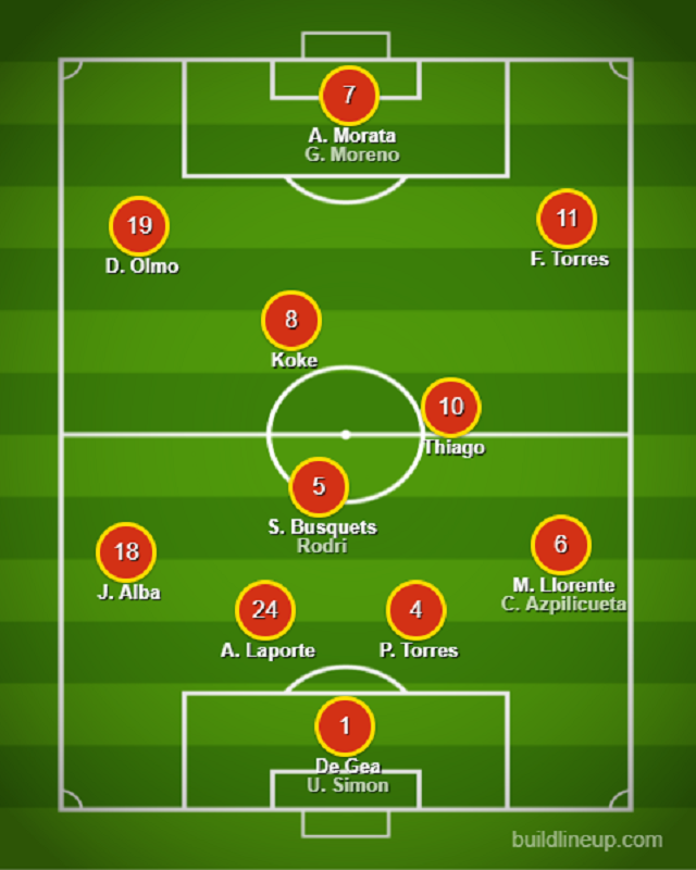 সার্জিও বুসকেটস (বার্সেলোনা), মার্কোস ইয়োরেন্তে (অ্যাটলেটিকো মাদ্রিদ), কোকে (অ্যাটলেটিকো মাদ্রিদ), থিয়াগো আলকানতারা (লিভারপুল), ফাবিয়ান রুইজ (নাপোলি), রদ্রি (ম্যানচেস্টার সিটি), পেদ্রি (বার্সেলোনা), দানি অলমো (আরবি লাইপজিগ),