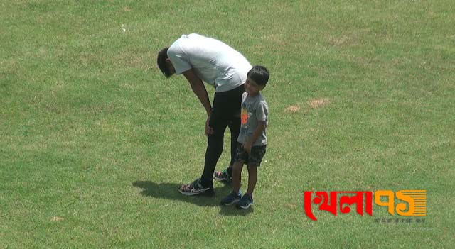 তাইজুল মাঠের এপ্রান্ত হতে ওপ্রান্তে ক্রমাগত দৌড়াচ্ছেন। আর এতোক্ষণ যে বাচ্চাটির কথা বলছিলাম, সেটি তাইজুলেরই পুত্র। নাম তাইফ জাওয়াদ বিন ইসলাম। বাবাকে দেখে দেখে ছোট্ট তাইফও মাঠে দৌড়াচ্ছে। খানিক বাদে এসে আবার অনুশীলনরত বাবার হাত ধরার চেষ্টা করছে। পিতা- পুত্রের মেলবন্ধনের এমন অদ্ভুত সুন্দর দৃশ্য দেখলে যে কারোরই চোখ জুড়িয়ে যাওয়ার কথা।