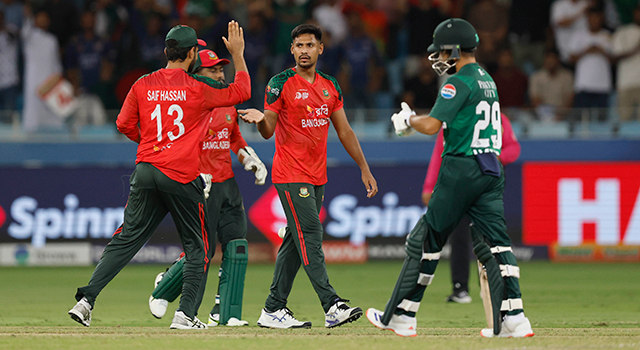 সালমান আলী আঘা ঠিক আগের ডেলিভারির মত করেেই খেলতে চেয়েছিলেন। কিন্তু, তিনি বুঝতে পারেননি, আসলে তিনি পড়েছেন মুস্তাফিজের ফাঁদে। বল ব্যাটে ছোয়া লেগে চলে যায় উইকেটরক্ষক-অধিনায়ক জাকের আলীর হাতে।