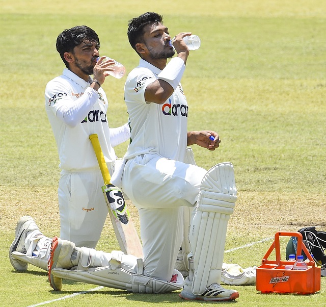 দলীয় ৩৯৪ রানে নাজমুল হোসেন শান্ত বিদায় নেওয়ার পর বেশীক্ষণ উইকেটে থাকতে পারেননি মুমিনুল হকও। ৩০৪ বলে ১২৭ রান করে আউট হয়ে যান বাংলাদেশের অধিনায়ক। এই দুই ব্যাটসম্যান ফিরে যাওয়ার পর পঞ্চম উইকেটে আবার ৫০ রানের জুটি গড়েন লিটন দাস ও মুশফিকুর রহিম। কিন্ত ২৫ ওভার বাকি থাকতেই আলোকস্বল্পতায় বন্ধ হয়ে যায় দিনের খেলা।
