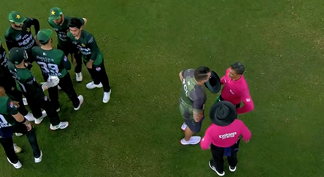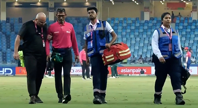 দুবাইয়ে আরব আমিরাতের ব্যাটিংয়ের ষষ্ঠ ওভার চলছিল তখন। আক্রমণে এসেই উইকেট নেওয়া সায়িম আইয়ুব আছেন বোলিংয়ে। পঞ্চম বলে বল গেল মিড উইকেটে। ভেতরের সার্কেলের ফিল্ডার বল কুড়িয়ে ফেরত ছুড়লেন—কিন্তু বিপত্তি বাঁধলো অন্য জায়গায়। বোলারের হাতে পৌঁছানোর পথে বল গিয়ে আঘাত করলো আম্পায়ারের মাথায়!