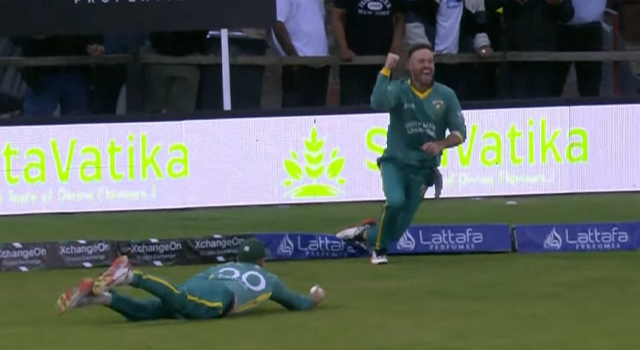 ইমরান তাহিরের গুগলি বলটা উড়িয়ে মারেন ওয়াইড লং-অন দিয়ে, ছুটে গিয়ে বলটা লুফে নেন ডি ভিলিয়ার্স। তবে বাউন্ডারি লাইনের কাছাকাছি থাকায় ভারসাম্য হারানোর আগে বলটা ফিরিয়ে দেন পেছনে। বল খুঁজে নেয় সারেল আরভির হাত।
