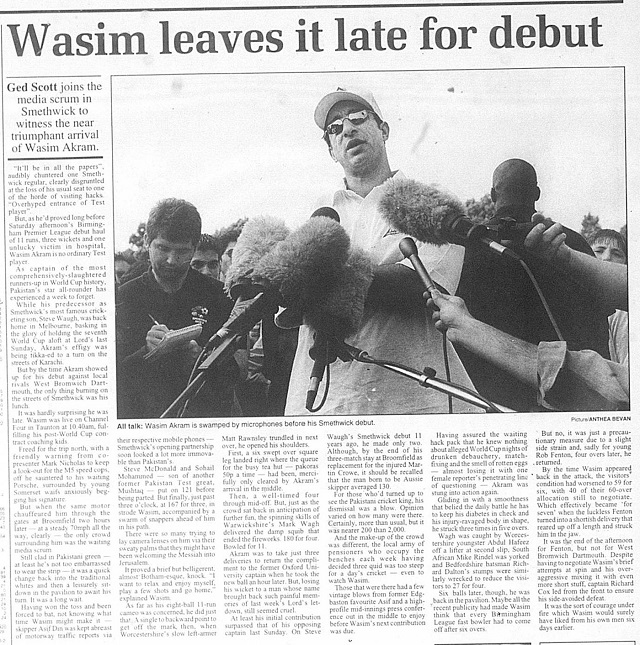 নিজের প্রথম ম্যাচে খেলা শুরুর নির্ধারিত সময়ে মাঠেই পৌঁছাতে পারেননি ওয়াসিম আকরাম। নিজের ধারাভাষ্য, বিজ্ঞাপনের শ্যুটিং সেরে যখন রওয়ানা দেন খেলার উদ্দেশ্য ততক্ষণে ম্যাচ শুরু হয়ে যাবার উপক্রম। ভাগ্যিস সেই ম্যাচে টস জিতেছিলেন স্মেথউইক অধিনায়ক আসিফ দিন।